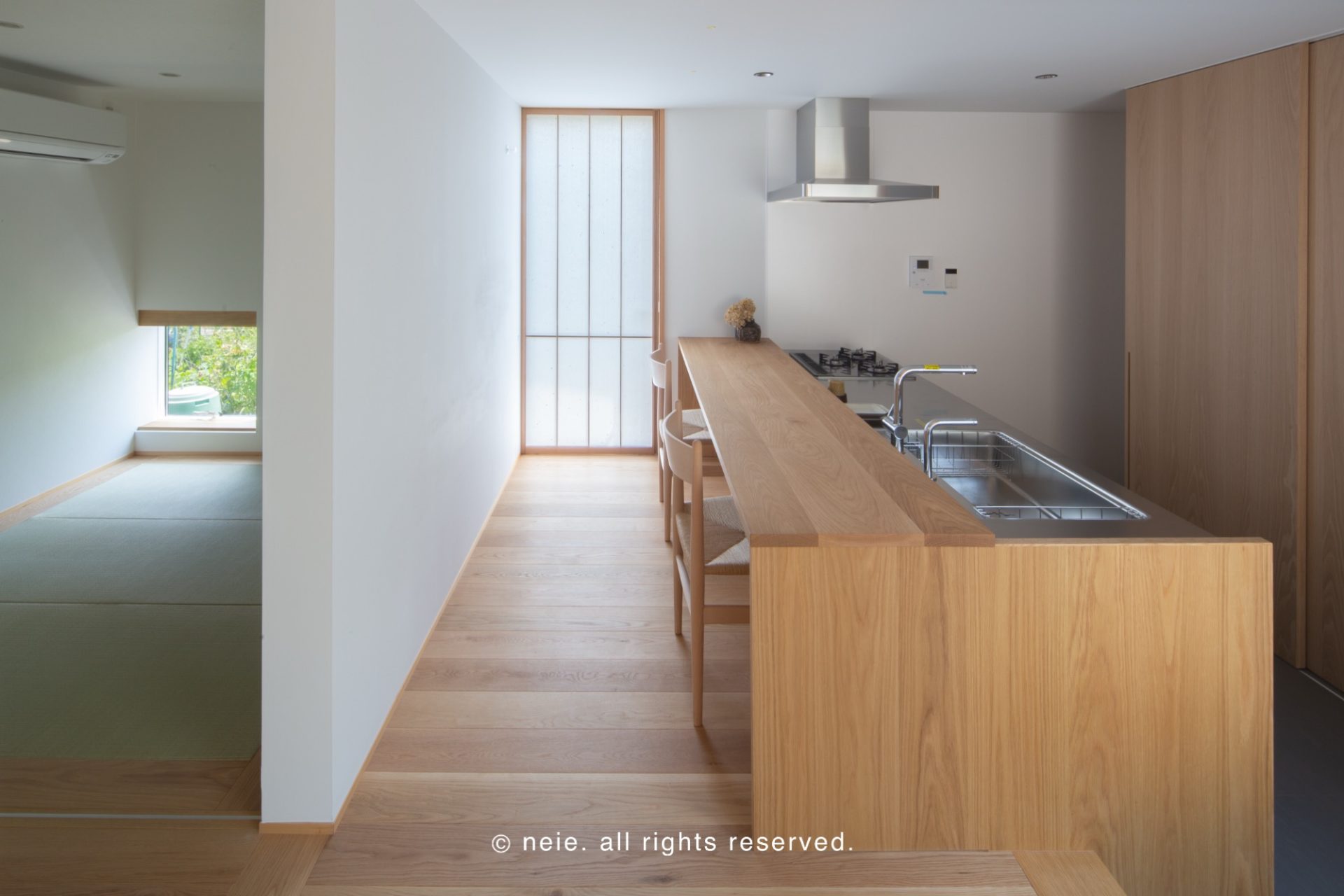 works HOME建築事例四季の自然を愛でる、木の平屋 四季の自然を愛でる、木の平屋 木の温もりに満ちた平屋。中庭の木々が季節の移ろいを告げ、室内に柔らかな光と影を落とします。 手の届く範囲で丁寧な暮らしを営むことで、日々のささやかな変化や、木や土が持つ素材の表情を慈しむ時間が生まれる。 広過ぎない空間だからこそ感じられる、心豊かな愉しみがここに広がっています。 Tags #中庭 #勾配天井 #和室 #塗り壁 #平屋 #造作キッチン #造作家具 #造作洗面台